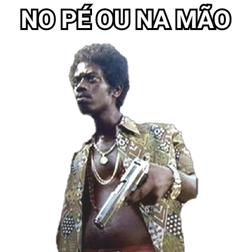 Homem negro com cabelo curto e camisa xadrez apontando uma arma para a esquerda com a frase 'NO PÉ OU NA MÃO' acima dele.