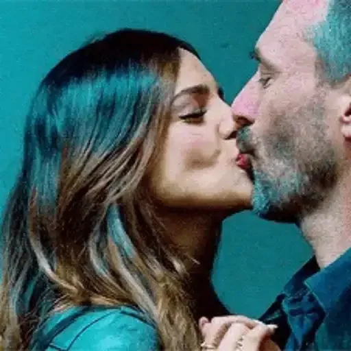 Um casal se beijando, a mulher com cabelos castanhos e o homem com barba e cabelo grisalho, contra um fundo azul turquesa.