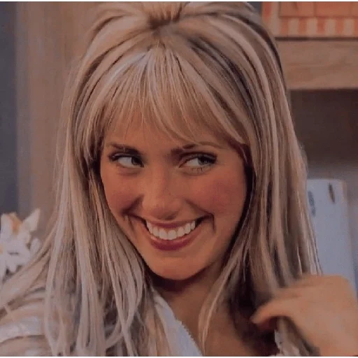 Uma mulher loira com franja e maquiagem, sorrindo e olhando para a câmera com uma expressão alegre.
