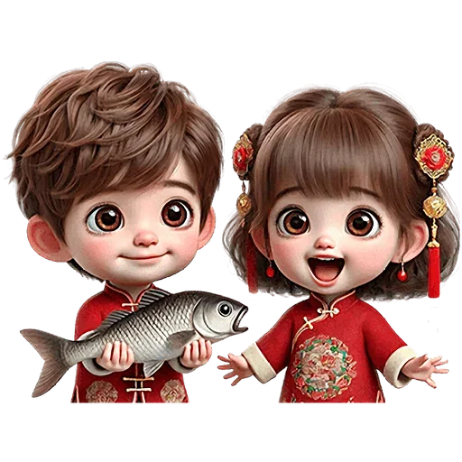 Dois personagens de anime, um menino e uma menina, vestidos com roupas vermelhas tradicionais chinesas. O menino segura um peixe, enquanto a menina sorri e estende as mãos.