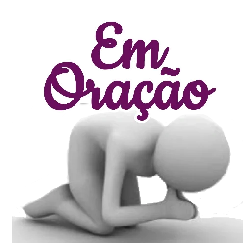 Uma figura cinza de uma pessoa ajoelhada com as mãos no chão e a cabeça baixa, com o texto 'Em Oração' em roxo acima dela.