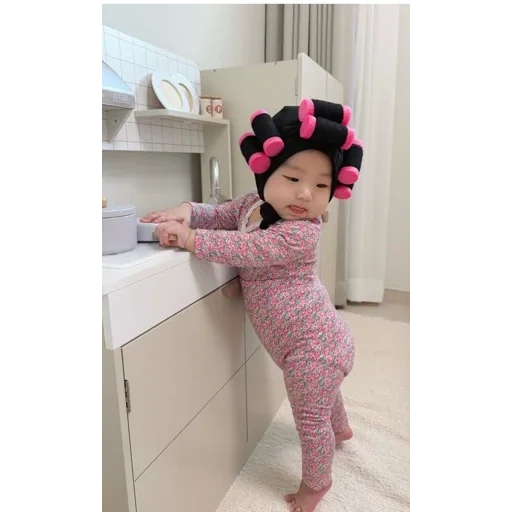 Um bebê pequeno usando rolos de cabelo rosa e preto está ao lado de uma bancada, com as mãos apoiadas na superfície.