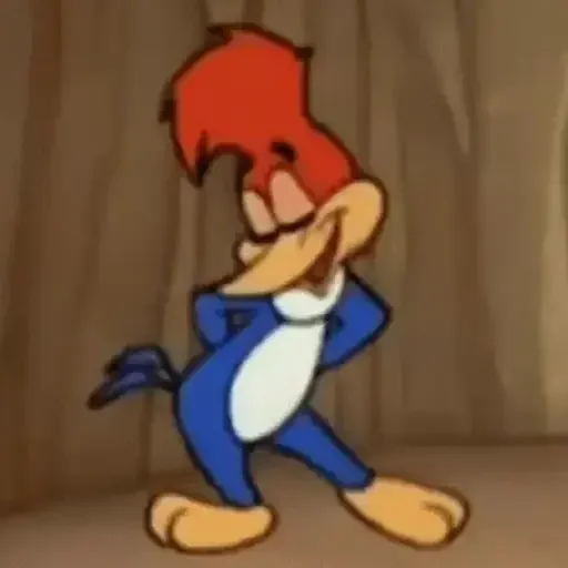 Personagem de desenho animado, pica-pau com cabelo vermelho e roupa azul, com expressão feliz e mão na parede.