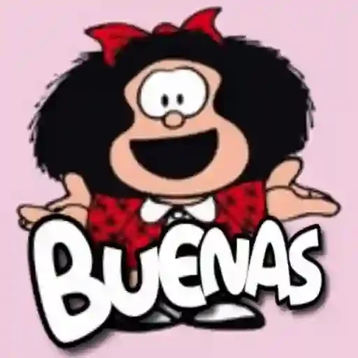 Uma menina de cabelo preto e volumoso com um laço vermelho na cabeça, vestindo uma blusa vermelha com manchas pretas e um colarinho branco. Ela tem um sorriso largo e as mãos abertas ao lado do corpo. A palavra 'Buenas' está escrita em letras grandes e brancas na frente dela.