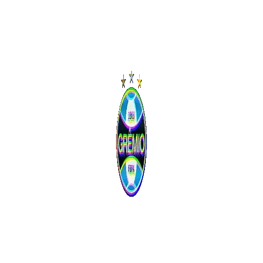 Uma prancha de surfe com o texto 'OPEN' e 'PENIS' em letras coloridas e um fundo azul, com um efeito de arco-íris.