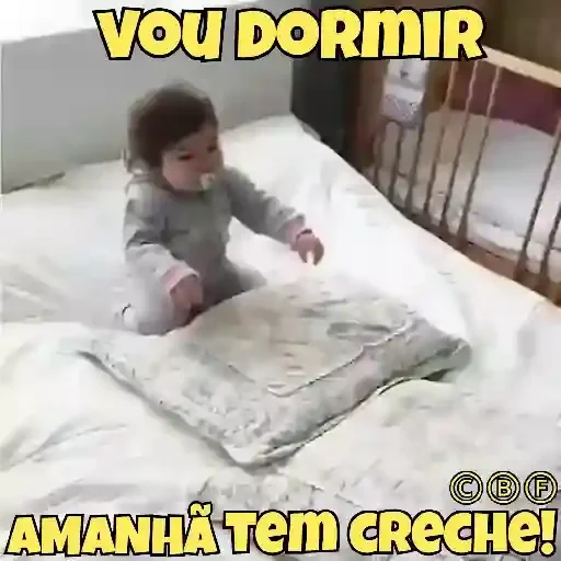 Um bebê deitado em uma cama com um travesseiro, vestindo um pijama cinza. A imagem tem o texto 'VOU DORMIR AMANHÃ TEM CRECHE!' em letras amarelas.