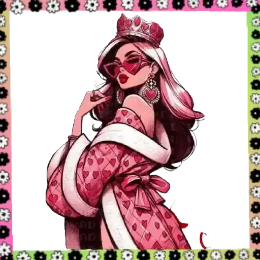 Uma mulher com coroa e robe rosa, com um sorriso sedutor e maquiagem rosa, contra um fundo branco com uma moldura de flores.