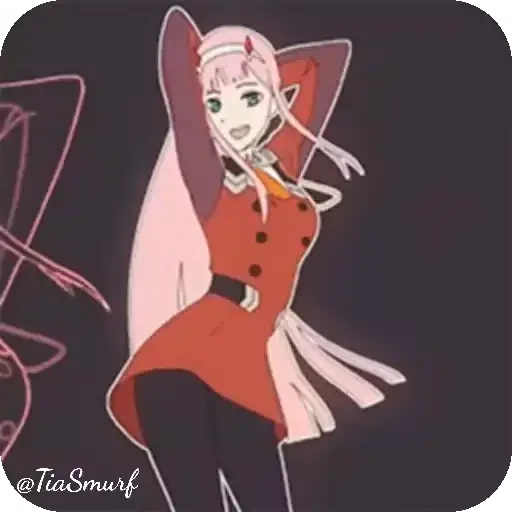 Uma garota de anime com cabelo rosa e orelhas de gato, vestindo um casaco vermelho e calças pretas, com um fundo escuro.