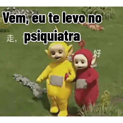 Dois personagens de Teletubbies, um de amarelo e outro de vermelho, com texto 'PARTIU PSIQUIATRA' em branco na parte…