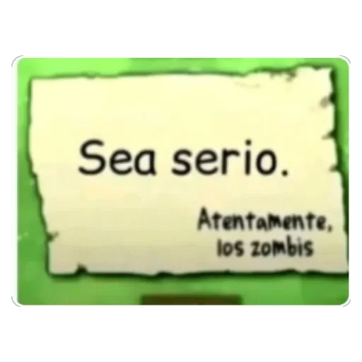 Um pedaço de papel com a frase 'Sea serio.' escrita em preto, acompanhada de 'Atentamente, los zombis' embaixo, tudo dentro de uma moldura verde.