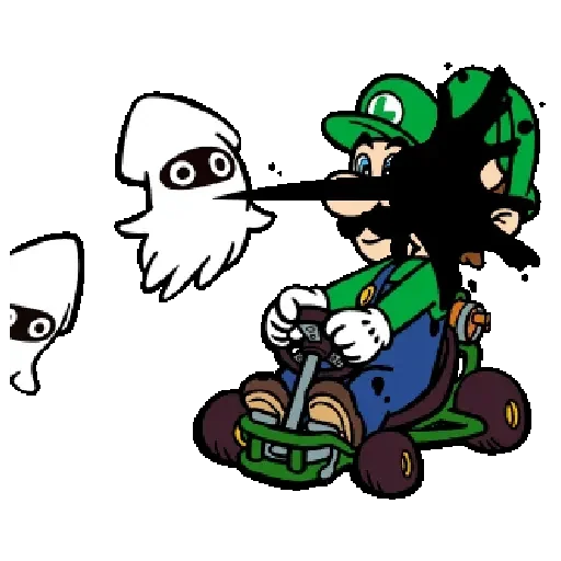 Luigi de Mario Kart com um bigode preto e um fantasma, em uma corrida de kart.