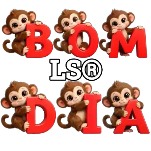 Seis macacos fofos em torno das letras 'BOM DIA', sendo um em cima de cada letra, com as letras 'B', 'O', 'M', 'D', 'I', 'A' em vermelho e 'LS®' em branco no centro.