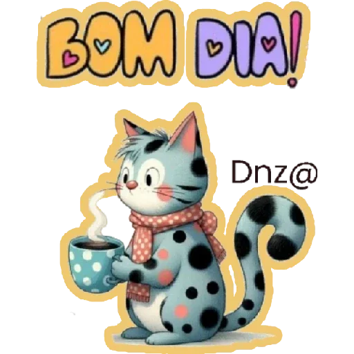 Gato azul com manchas pretas e rosa, usando cachecol xadrez, segurando uma xícara de café com vapor saindo, com a frase 'BOM DIA!' em letras coloridas acima.