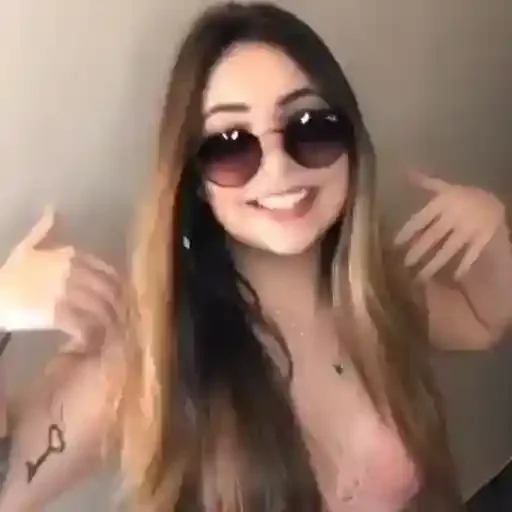 Uma jovem mulher com cabelos castanhos e loiros, óculos de sol e um sorriso, fazendo um gesto com as mãos.