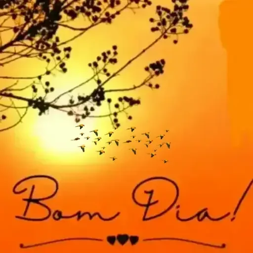 Uma árvore com flores e galhos contra o sol de fundo laranja, com o texto 'Bom Dia!' em caligrafia cursiva.