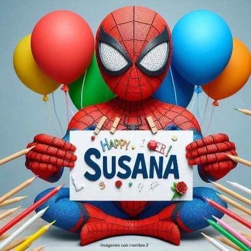 Homem-Aranha segurando um cartão com o texto 'HAPPY BIRTHDAY SUSANA' e balões coloridos ao fundo.