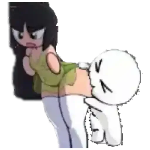 Uma garota com cabelo preto e expressão zangada abraçando um personagem branco com expressão de sono.