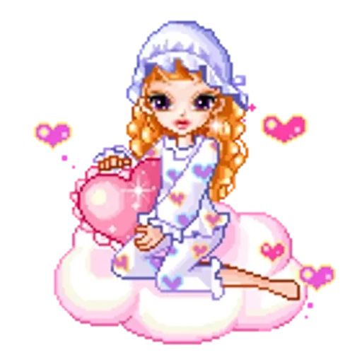 Menina de cabelos laranjas, de pijama branco com corações, sentada em uma nuvem com um coração rosa. Ela está usando touca de dormir.