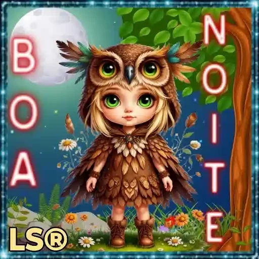 Uma coruja fofa com olhos grandes e penas marrons, em um cenário noturno com lua cheia, flores e árvore. A coruja tem um colar e botas, e ao lado estão as letras 'BOA NOITE' em vermelho.