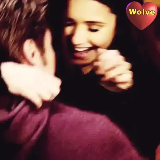 Um casal se beijando, com o homem de cabelo castanho e camisa roxa e a mulher com um coração vermelho ao fundo com a palavra 'Wolve'.
