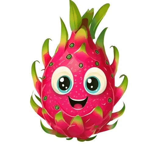 Uma fruta do dragão cartoonizada com olhos grandes e um sorriso, tendo espinhos verdes e rosa.
