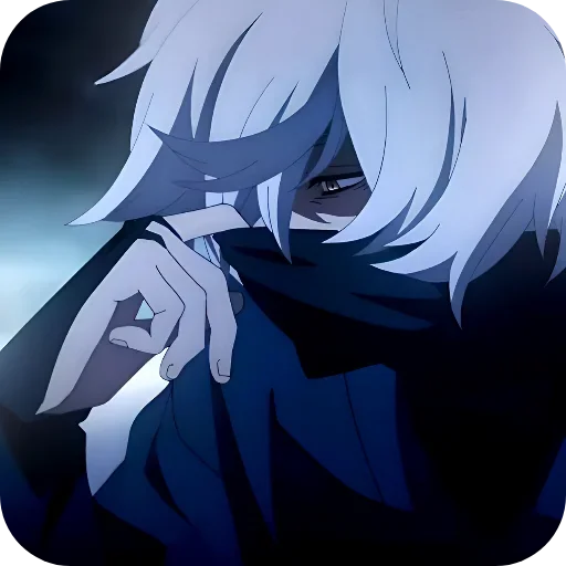 Personagem de anime com cabelo branco e roupa escura, cobrindo o rosto com a mão.