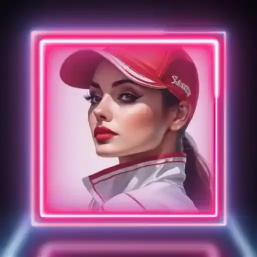 Uma mulher jovem com um boné vermelho e uma jaqueta branca olha para o lado com uma expressão neutra, enquadrada por um contorno rosa e azul.