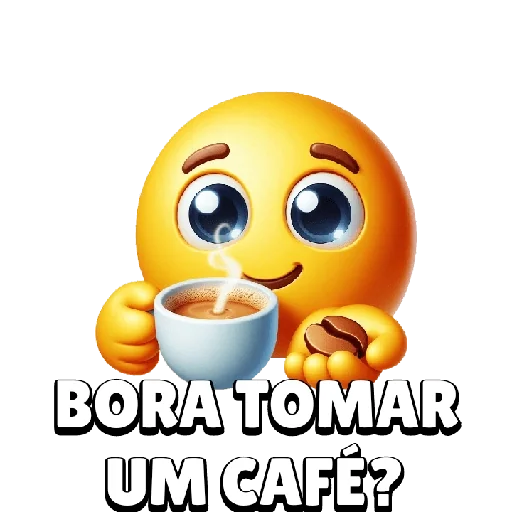 Um emoji amarelo com expressão simpática, segurando uma xícara de café e convidando para tomar um café. O texto 'Bora tomar um café?' está escrito abaixo.