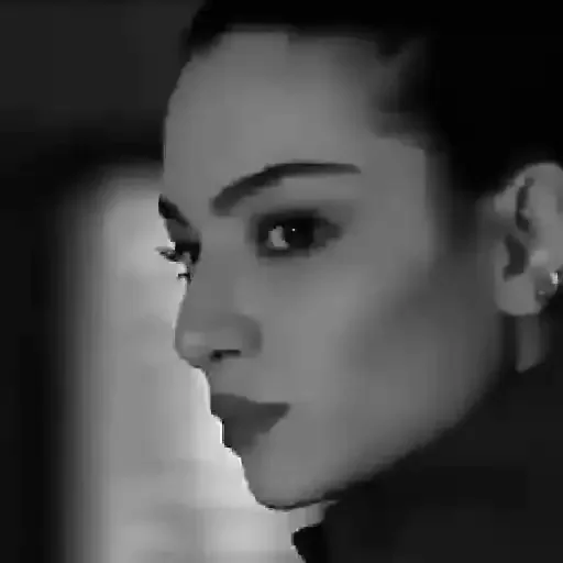 Rosto de uma mulher com expressão séria, olhar para o lado, em preto e branco.