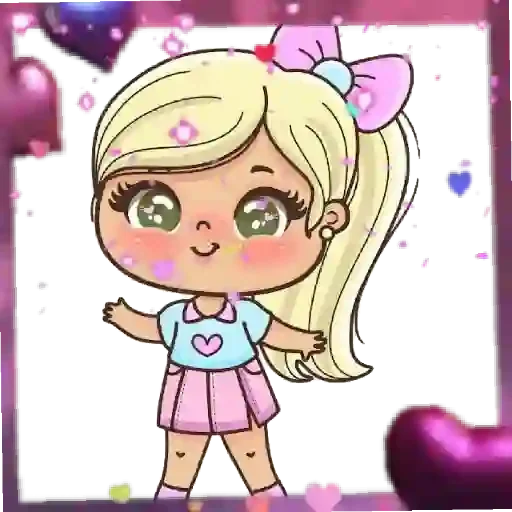 Uma menina de cabelo loiro com um laço rosa, vestindo uma blusa azul com um coração rosa e uma saia rosa, com coraçõezinhos ao redor.