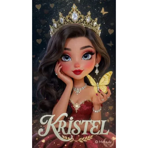 Uma princesa de olhos azuis e cabelo castanho escuro usando uma coroa dourada e um vestido vermelho, com uma borboleta amarela na mão. O nome 'Kristel' aparece em letras douradas abaixo dela.