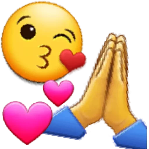 Um emoji de rosto amarelo com olhos fechados e beijo, mãos juntas em oração com luvas azuis e três corações rosa e vermelho.