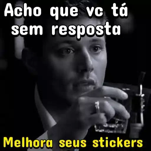 Um homem com expressão séria, fumando, com o texto 'Acho que vc tá sem resposta' em branco acima e 'Melhora seus stickers' em amarelo abaixo.