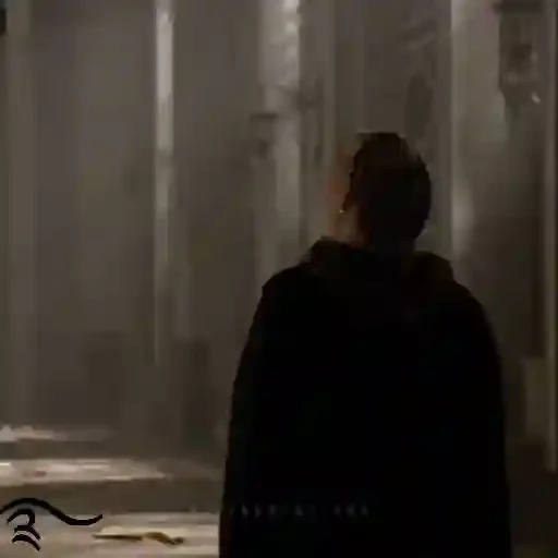Um homem de costas em um ambiente escuro e embaçado, com um olho no canto inferior esquerdo.