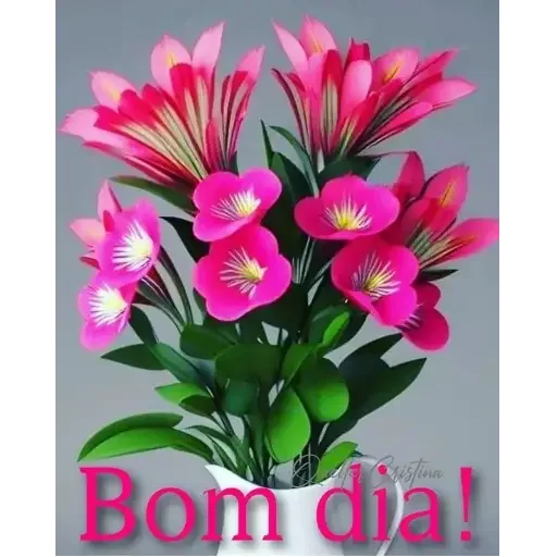 Um buquê de flores rosadas em um vaso branco com a frase 'Bom dia!' em letras rosadas.
