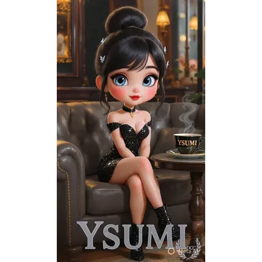Uma garota de anime sentada em um sofá com um vestido preto, cabelo preto em um coque e olhos azuis. Ela está em um ambiente com uma mesa e uma xícara de café ao lado.