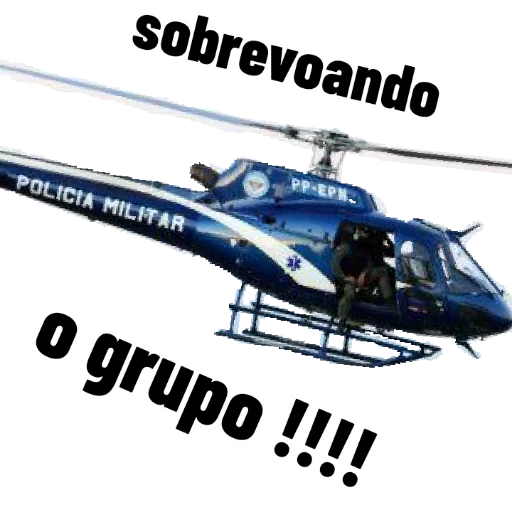 Helicóptero da polícia militar com as palavras 'sobrevoando o grupo !!!!' em preto. O helicóptero é azul e branco.