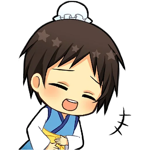 Menino de cabelos castanhos com expressão feliz, usando um yukata azul e branco, com um enfeite branco na cabeça.