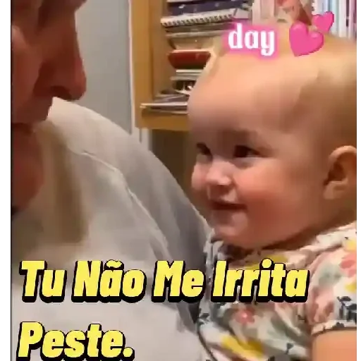 Uma bebê com expressão facial séria e um homem ao lado, com o texto 'Tu Não Me Irrita Peste.' sobreposto.