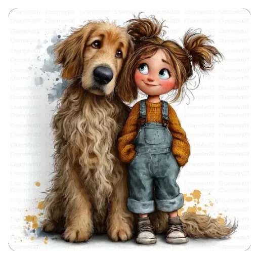 Uma menina com pigtails castanhos e macacão azul ao lado de um cachorro golden retriever castanho, ambos com expressões fofas.