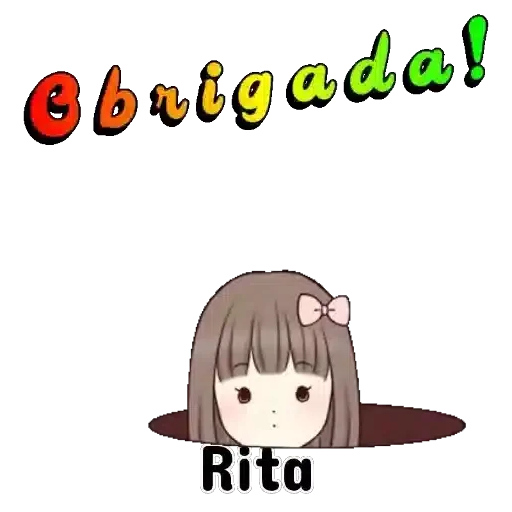 Menina com cabelo castanho e faixa rosa na cabeça, com o texto 'Obrigada!' em cima e 'Rita' em baixo.