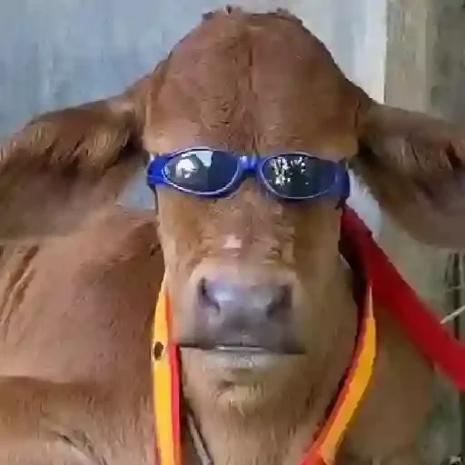 Vaca castanha usando óculos de sol azuis e uma corda laranja e vermelha no pescoço.
