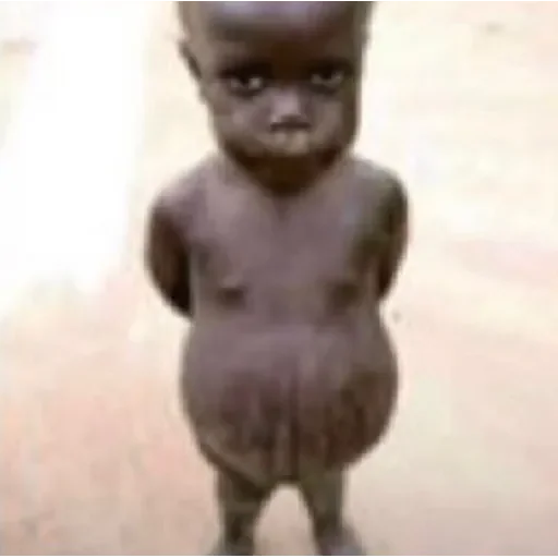 Um menino negro nu com expressão séria, mãos atrás das costas.