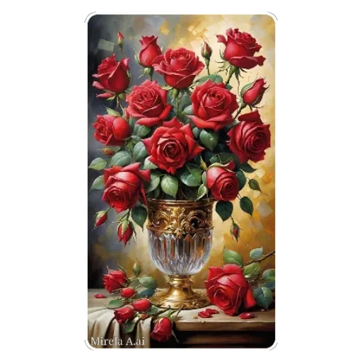 Um buquê de rosas vermelhas em um vaso de cristal com detalhes em ouro, sobre uma mesa com algumas pétalas caídas.