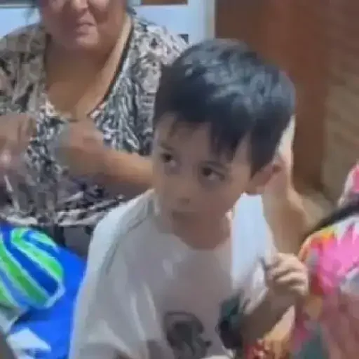 Menino com expressão séria, vestindo uma camiseta branca, ao lado de uma mulher. Ele parece ter um brinquedo na mão.