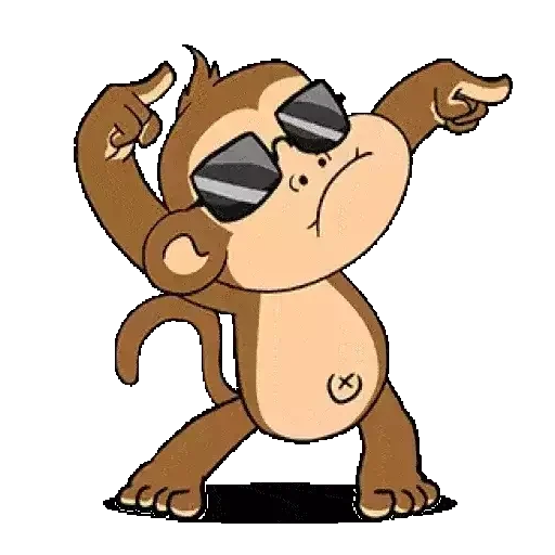 Macaco cartoon com óculos de sol fazendo pose engraçada com as mãos para cima.