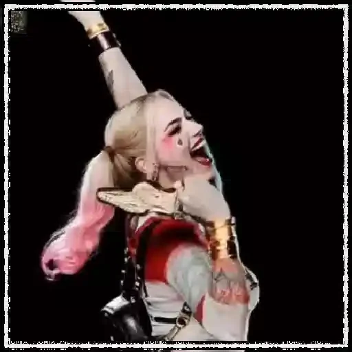 Lady Gaga como Harlequin com maquiagem colorida e fantasia de palhaço, expressão de surpresa ou choque.