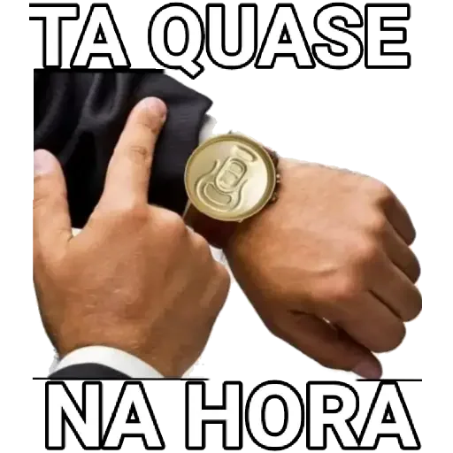 Mãos de uma pessoa com um relógio de pulso dourado e um gesto de polegar para cima, com o texto 'TA QUASE NA HORA' em letras grandes.