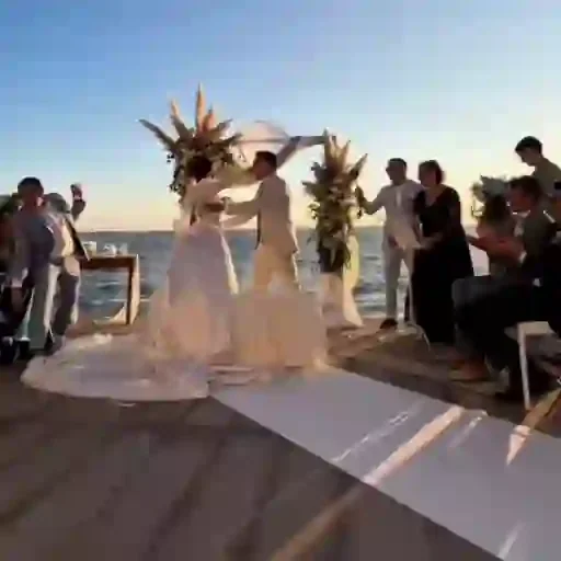 Casal de noivos dançando em uma cerimônia de casamento ao ar livre, com o mar ao fundo e convidados ao redor. O noivo e a noiva estão com trajes de casamento.