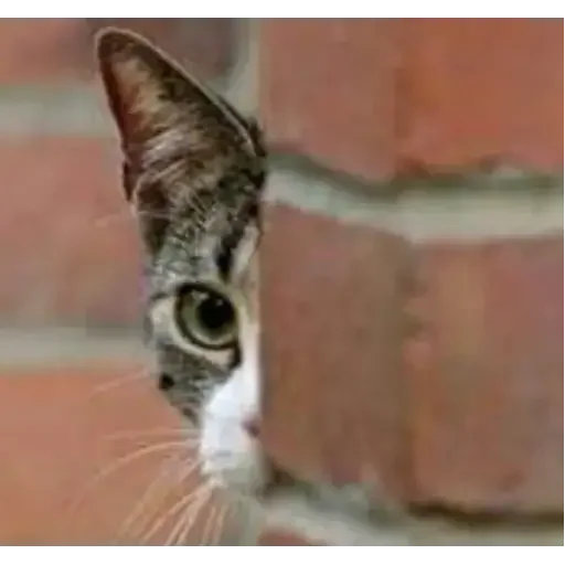 Um gato com pelagem cinza e branca espiando de trás de uma parede de tijolos vermelhos.